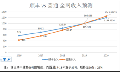 順豐全網收入份額一度達20%。但隨著增速落后逐年下滑,很可能要失去老大地位。圓通申通單票運費是順豐的1/2,只要件量是順豐的2倍。就有可能超過順豐。2016年2月圓通老板娘張小娟在杭州兩會上透露圓通2015年總件量約35億件(實際30億票),全網營收350億元(實際可能為300億元)。根據圓通發(fā)布的業(yè)績預告,2016年件量和收入都大于40%的增長。全網收入可能超420億元。假若保持這種趨勢下去,圓通甚至中通、申通等都可能在接下來三五年內在全網收入上超越順豐, 甚至比順豐提早突破千億大關。順豐可能掉至三四名甚至更后。