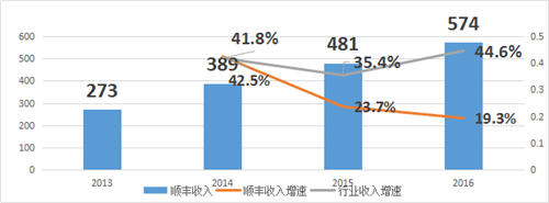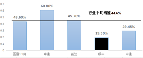 順豐在2016年的國內快遞業(yè)務(時效產品,不包括其重貨、冷運、倉配業(yè)務,這些也未計入郵政局快遞統(tǒng)計)收入增速只有15%左右。整體收入增速19.5%也遠遠落后于行業(yè)同期的44.6%?;乜唇陻?shù)據,其增速早與行業(yè)脫節(jié),且差距拉大。在2016年低于行業(yè)25個點,低于申通圓通一半,不足中通1/3。