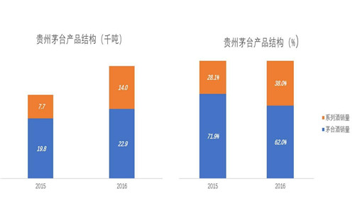 貴州茅臺(tái)將產(chǎn)品分為兩大類(lèi):茅臺(tái)酒、其他系列酒(茅臺(tái)王子酒、茅臺(tái)迎賓酒、賴(lài)茅酒等)。2016年,兩類(lèi)產(chǎn)品銷(xiāo)量分別為2.3萬(wàn)噸和1.4萬(wàn)噸,同比增幅分別為15.76%和81.69%。#5700多億市值由2.3萬(wàn)噸茅臺(tái)酒撐起#