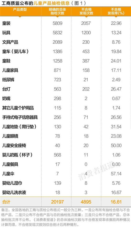 2017年5月,《消費(fèi)者報道》通過梳理全國126個工商與質(zhì)檢部門10年來公開的20197條兒童產(chǎn)品抽檢數(shù)據(jù),作出不合格品牌黑榜警示,以及重點(diǎn)不合格產(chǎn)品類型的消費(fèi)建議。