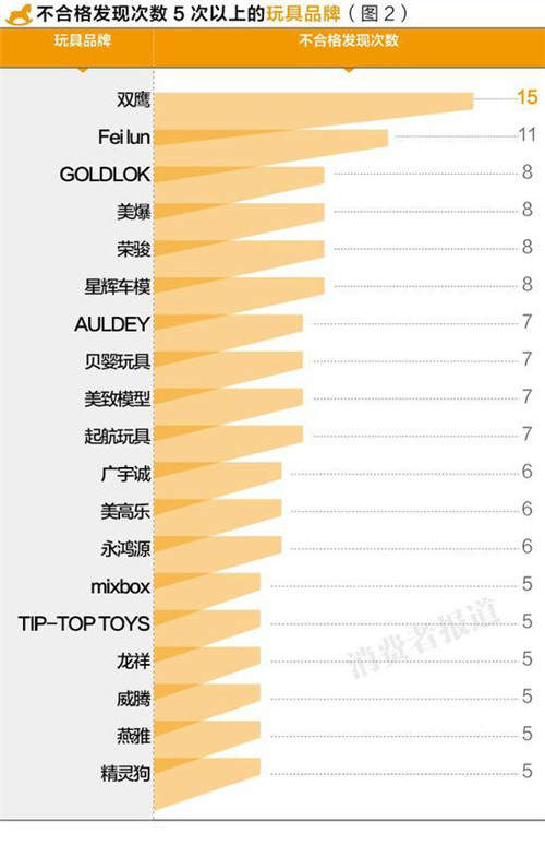 雙鷹與飛輪的不合格次數(shù)超過10次,而美高樂、星輝車模等較知名品牌也數(shù)次登上黑榜。兒童玩具的抽檢不合格項(xiàng)目主要集中在標(biāo)志與危險警示不規(guī)范、以及小零件、尖端傷害等方面。