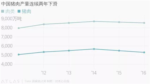 這或許只是個(gè)開始,根據(jù)咨詢公司 Euromonitor 的估算,中國豬肉銷量從 2014 年的 4249 萬噸減少至去年的 4085 萬噸,而且今年還會繼續(xù)下跌。