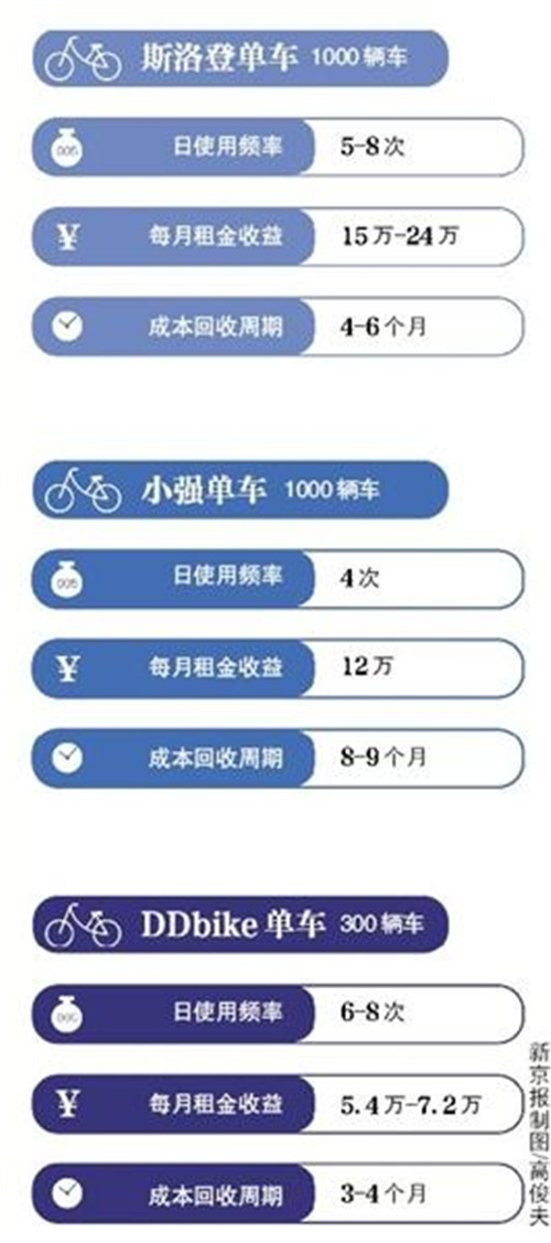 另一個來自成都的DDbike則稱,以15萬人口的縣城為例,投放300輛車,資金約13.8萬,客戶端軟件的使用費用3萬,成本總計18萬元,每輛車的日均使用頻率為6-8次,以此計算3至4個月就可收回投資本金。
