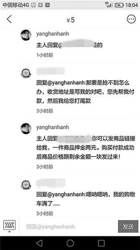 “你到時候把商品的鏈接給我,然后就是你的收貨地址,每件商品你要給我2塊錢的押金,到了11號那天,我來幫你搶東西,然后付款,沒搶到的話我會退押金,搶到的東西會直接由賣家郵給你,我把交易成功的截圖發(fā)給你之后,你給我付尾款就行了。”這位出租“購物車車位”的商家說,之所以每件商品需要支付2元的押金,是為了防止違約。