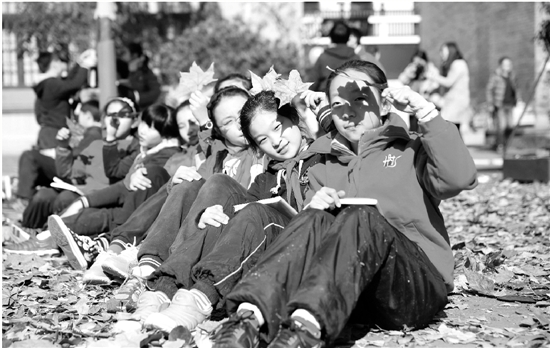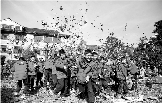 中午,當(dāng)錢報(bào)記者趕到學(xué)校時(shí),被眼前的景象驚到了:150米的環(huán)形操場中間,鋪滿了金黃色的落葉,一群學(xué)生正把落葉滿滿地捧起,再高高地往上一拋,于是只見滿眼的落葉紛飛……