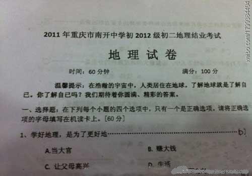 有在試卷上創(chuàng)意答題,讓人爆笑的學(xué)生,更有云天霧罩,不著邊際出題的老師。真不知道出題是這些老師是怎么想的。