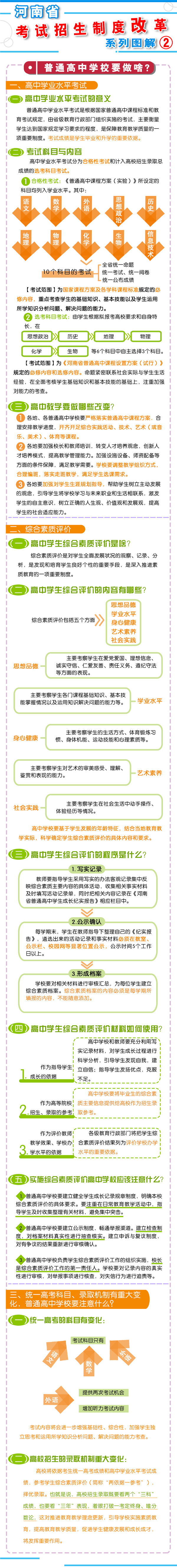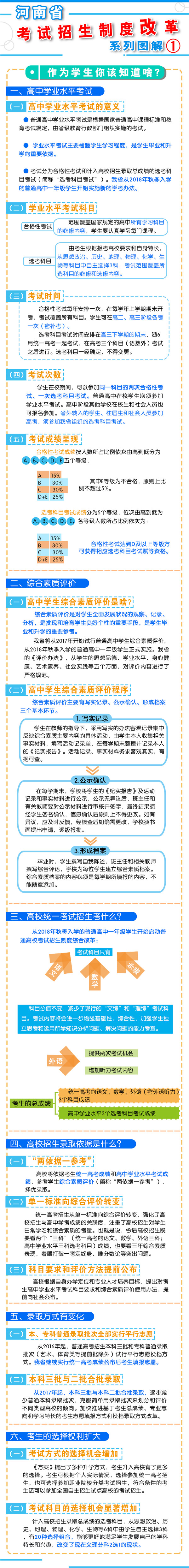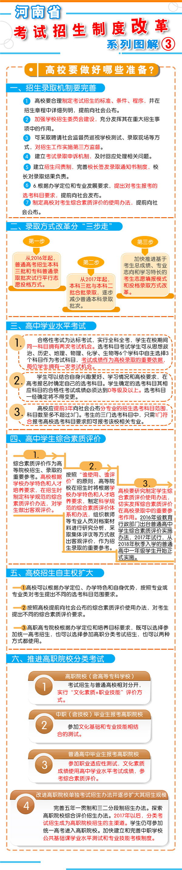 四、改革監(jiān)督管理機制 加強信息公開,全面實施高校招生“陽光工程”,進一步擴大信息公開的范圍和內(nèi)容。強化考試安全,堅持從嚴治考,完善考試招生誠信制度,落實誠信結果使用要求。加大違規(guī)查處力度,加強考試招生全程監(jiān)管,嚴厲打擊和嚴肅查處考試招生中的違法違規(guī)行為,及時公布查處結果,嚴格責任追究?! ?strong>五、2018年秋季開始實施 從2018年秋季入學的普通高中一年級學生開始啟動普通高??荚囌猩贫染C合改革?! ≡诟母锟荚嚳颇吭O置上,不分文理科,外語科目提供兩次考試機會。考生的總成績由統(tǒng)一高考的語文、數(shù)學、外語(含外語聽力)3個科目成績和高中學業(yè)水平3個選考科目考試成績組成。保持統(tǒng)一高考的語文、數(shù)學、外語分值不變。 在改革招生錄取機制上,推進基于統(tǒng)一高考成績和高中學業(yè)水平考試成績、參考學生綜合素質(zhì)評價的多元錄取機制改革。高校要根據(jù)自身辦學定位和專業(yè)人才培養(yǎng)目標,提出對考生高中學業(yè)水平考試科目要求和綜合素質(zhì)評價使用辦法,提前向社會公布?! ?016年省教育行政部門出臺普通高中學業(yè)水平考試實施辦法和普通高中學生綜合素質(zhì)評價實施辦法,從2018年秋季入學的普通高中一年級學生開始正式實施?! ?strong>省教育廳文件通知: 1、關于印發(fā)《河南省普通高中學業(yè)水平考試實施辦法(試行)》的通知 2、關于印發(fā)《河南省普通高中學生綜合素質(zhì)評價實施辦法(試行)》的通知