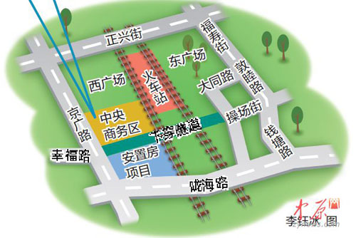 讓人欣喜的是,西廣場南側(cè)的幸福路將連接火車站東西兩個廣場,打通下穿隧道。幸福路南起京廣路,北到操場街,不但可行駛機(jī)動車,還可供非機(jī)動車、行人通行。從規(guī)劃圖上可看出,規(guī)劃中的幸福路,和現(xiàn)狀幸福路,不在一條直線上,它們在京廣路上有拐角。