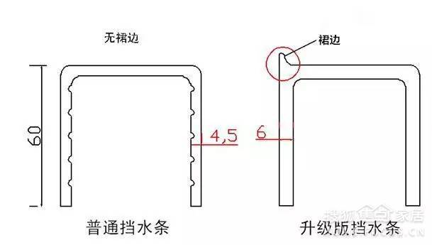 有些賣家吹噓有裙邊的擋水條有多好,實際上是誤導(dǎo)消費者。有裙邊的擋水條實際上是用在帶玻璃的淋浴房下面做石基用的,玻璃是放在擋水條中間的,裙邊是防止水從玻璃下滲入擋水條。