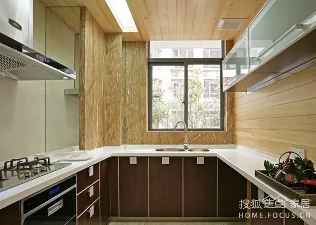 U型櫥柜設(shè)計(jì)儲(chǔ)物功能大,左邊吊柜統(tǒng)一采用開放柜與封閉柜不僅美觀,而且方便擺放和儲(chǔ)藏物體,棕色背景與面板形成呼應(yīng),使空間更為溫馨、自然。