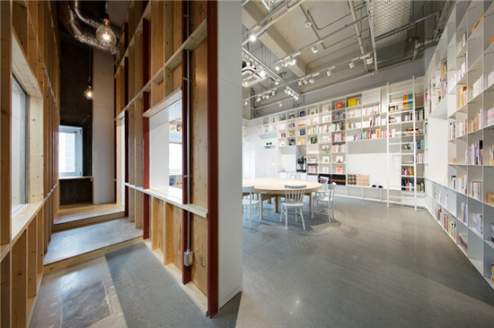這個(gè)建筑工作室通過(guò)創(chuàng)建一個(gè)既包括圖書(shū)館,另外還有一個(gè)蛋糕店的空間來(lái)完成人們輕松聚集在一起這個(gè)愿望??此坪敛幌嚓P(guān)的兩個(gè)空間,只要提供了一個(gè)聚集區(qū),就形成了一個(gè)互動(dòng),兩者就聯(lián)系在了一起。