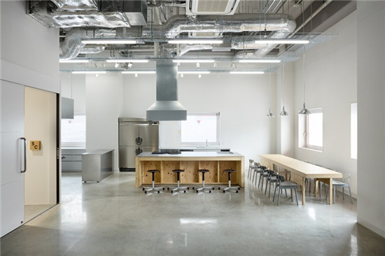 廚房也被安排在五樓,跟會(huì)議室在一起。出完飯以后,還可以選擇逛逛圖書(shū)館。將兩個(gè)不同功能的空間結(jié)合在一起,也是一種特有的解決方案。可以試著用烹飪的方式把知識(shí)轉(zhuǎn)化成行動(dòng)。
