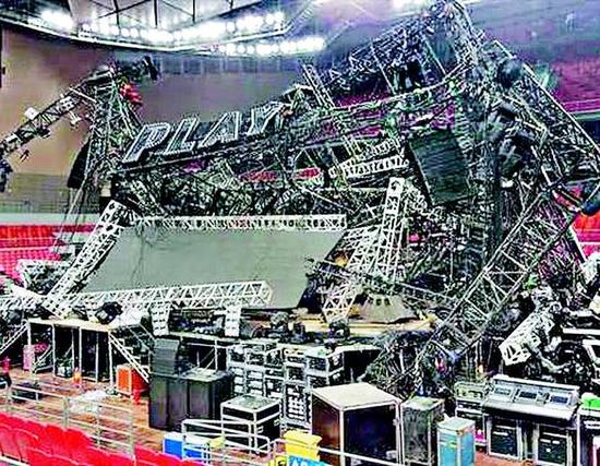 據(jù)臺灣媒體報道,蔡依林(Jolin)本周六(31日)預定在廣西南寧舉行“蔡依林2015 PLAY世界巡回演唱會”,現(xiàn)場舞臺近日已幾乎準備搭建完成,不料,該舞臺29日下午5點多,多條大型鋼鐵結(jié)構(gòu)的燈架突然倒塌砸下來,現(xiàn)場一片混亂,造成1名工人意外死亡,且有13名工人受傷。Jolin人還沒到現(xiàn)場,本來預計今日(30日)抵達,若是在演唱會當天才發(fā)生倒塌,后果更是不堪設想。經(jīng)紀人表示正在了解狀況,是否取消演唱會,仍要看舞臺修復狀況。