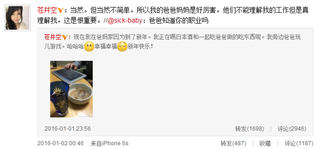 隨后有網(wǎng)友留言,問及“你爸爸知道你職業(yè)嗎?”蒼井空很是坦誠回答:“當然。但當然不簡單。所以我的爸爸媽媽是好厲害。他們不能理解我的工作但是真理解我。這是很重要?!备芯W(wǎng)友敏感地問道:“蒼老師的父親也看過她的作品嗎?”蒼井空反問“如果你爸爸的話怎么樣”讓網(wǎng)友為其機智點贊。