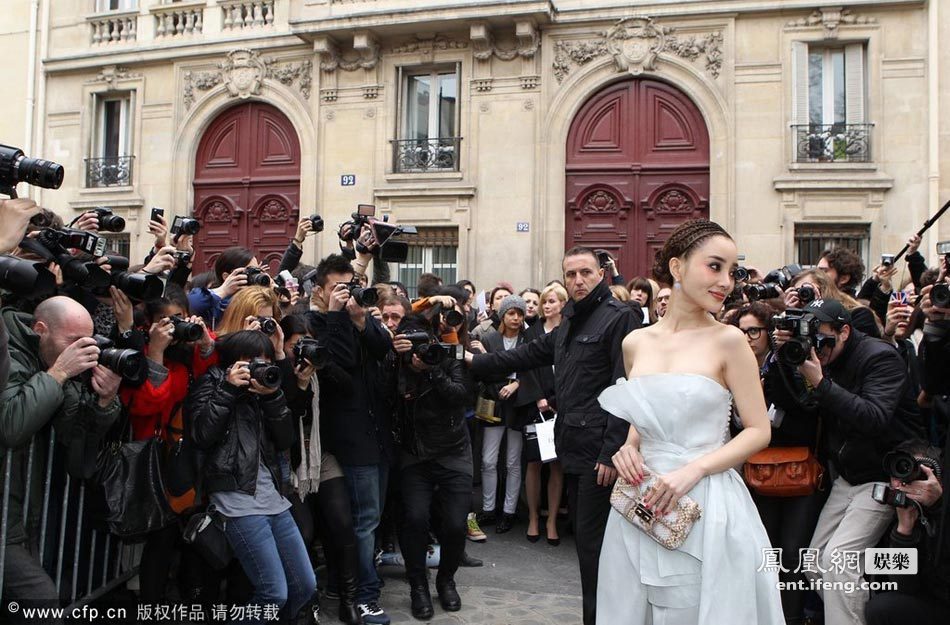 當?shù)貢r間3月2日,巴黎,2012巴黎時裝周(秋冬):某品牌秀場,中國明星扎堆看秀。李小璐“阿凡達”發(fā)型個性亮相,身著月牙色抹胸裙甜美,“童顏巨乳”成功吸睛。張雨綺和Angelababy都身披皮草亮相彰顯貴氣。林鵬發(fā)型夸張,粗黑鬢角酷似貓王氣場十足。社交名媛、珠寶設計師萬寶寶也亮相了秀場。
