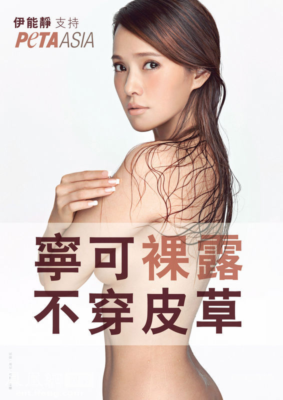 2012年3月8日,香港,44歲的伊能靜原本是皮草愛(ài)好者,曾收藏超過(guò)50件皮草,不過(guò)她為了反皮草,加入善待動(dòng)物組織知名的“寧可裸露,不穿皮草”活動(dòng)。她上半身全裸入鏡拍攝反皮草廣告時(shí),一絲不掛只用雙臂抱著34D秀胸入鏡,其中一張側(cè)面的照片,還露出股溝。