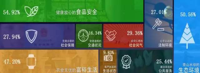 重視“舌尖上的安全”,提到“全面小康社會(huì)”最期待的圖景,“健康放心的食品安全”(54.92%)最被百姓看重。其次,山青水綠的生態(tài)環(huán)境(50.56%)和衣食無(wú)憂(yōu)的富裕生活(47.20%)也很重要。