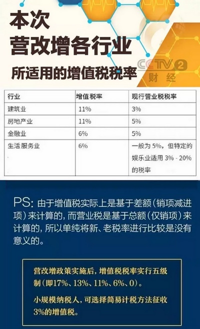 5月1日“營(yíng)改增”全面推開(kāi),建筑業(yè)、房地產(chǎn)業(yè)、金融業(yè)、生活服務(wù)業(yè)將告別營(yíng)業(yè)稅。這項(xiàng)看起來(lái)“高大上”的改革,涉及近千萬(wàn)戶(hù)新納稅人、全年減稅超5000億元。營(yíng)業(yè)稅退出歷史,你我能獲多大好處?