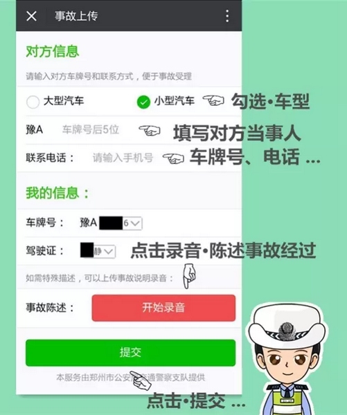 該功能上線后,親們,再也不用站路邊“說(shuō)個(gè)舌尖帶火,嗓子冒煙”了,只需拍幾張現(xiàn)場(chǎng),照片發(fā)個(gè)微信就可以馬上閃人、撤離事故現(xiàn)場(chǎng)!既不造成交通擁堵又安全省力。