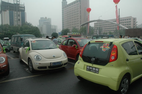 啟動(dòng)儀式現(xiàn)場(chǎng),愛心送考車輛整齊的貼上了愛心送考車貼,后視鏡上扎上了綠絲帶