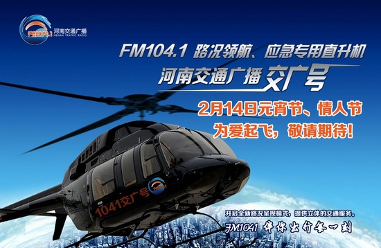 2月14日,河南交通廣播將送來(lái)“中西合璧情人節(jié)”重磅大禮——“向愛(ài)說(shuō)sorry”交廣號(hào)私人定制浪漫情人節(jié)。當(dāng)天,1041交廣號(hào)直升機(jī)將再次為愛(ài)起飛,全景呈現(xiàn)省會(huì)鄭州交通路況,并聯(lián)合二七萬(wàn)達(dá)廣場(chǎng),提供情人節(jié)私人專機(jī)浪漫飛行,現(xiàn)在參與河南交通廣播節(jié)目微信互動(dòng),就有機(jī)會(huì)和你的TA坐上1041交廣號(hào)專機(jī),獨(dú)享二人世界,不妨來(lái)一場(chǎng)浪漫的空中求婚儀式。