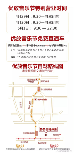 鄭州火車站:乘坐地鐵1號(hào)線至市體育中心站,可以在紫荊山公園西門,乘坐優(yōu)放音樂節(jié)免費(fèi)班車。