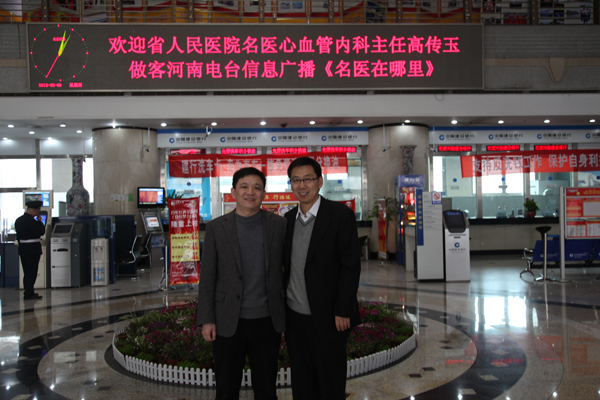 開播第一天做客節(jié)目的嘉賓省人民醫(yī)院心血管內(nèi)科主任高傳玉與河南電臺(tái)信息廣播總監(jiān)李金鋒合影