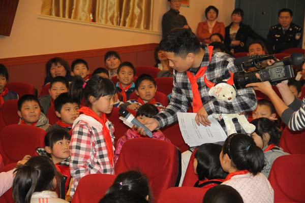 活動現(xiàn)場信息廣播主持人張東為答對問題的小學(xué)生派送禮物