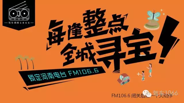 參與方式:現(xiàn)在立刻馬上關(guān)注“駕車1066”官微-每天收聽FM106.6-獲取每個整點通關(guān)密語-回復(fù)通關(guān)密語到官微后臺-即可獲得藏寶圖-到指定地點領(lǐng)獎呦!