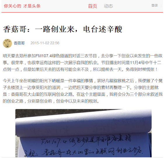 自媒體,以“香菇哥”的名義在各個自媒體平臺申請入駐,最先申請的是搜狐媒體平臺,運(yùn)作的這幾個月,搜狐上的累計(jì)閱讀量目前已達(dá)到16萬。后來又申請了今日頭條,一點(diǎn)咨詢,鳳凰新聞媒體平臺等渠道。也建立了自己的微信公眾號。目前所有的宣傳渠道的累計(jì)閱讀量已經(jīng)突破了七十萬。就是在這些渠道上宣傳自己的創(chuàng)業(yè)故事以及大山里面的人文風(fēng)情來傳播。