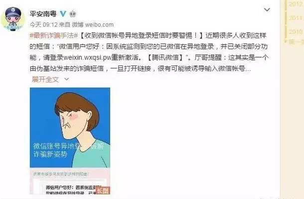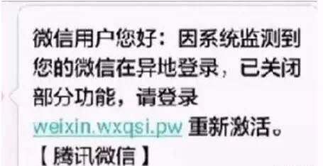 #最新詐騙手法#【收到微信帳號(hào)異地登錄短信時(shí)要警惕!】近期很多人收到這樣的短信:“微信用戶您好:因系統(tǒng)監(jiān)測到您的已微信在異地登錄,并已關(guān)閉部分功能,請(qǐng)登錄weixin.wxqsi.pw重新激活。【騰訊微信】”。廳哥提醒:這其實(shí)是一個(gè)由偽基站發(fā)來的詐騙短信,一旦打開鏈接,很有可能被誘導(dǎo)輸入微信帳號(hào)、微信密碼、支付密碼、驗(yàn)證碼等,后果不堪設(shè)想……