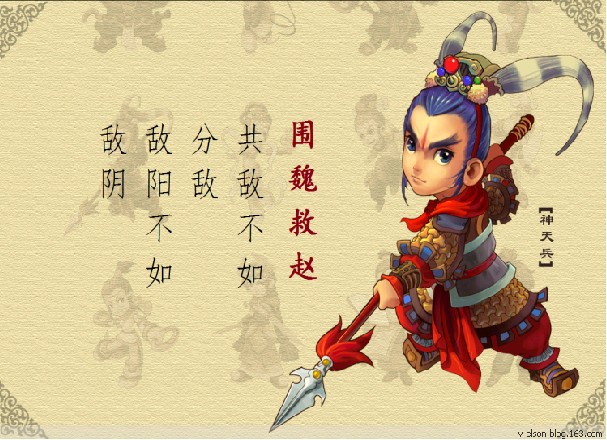 譯文:攻打兵力集中的敵人,不如設(shè)法使它分散兵力而后各個擊破;正面攻擊敵人,不如迂回攻擊其薄弱空虛的環(huán)節(jié)。本指圍攻魏國的都城以解救趙國。后指襲擊敵人后方的據(jù)點以迫使進攻之?dāng)吵吠说膽?zhàn)術(shù)?,F(xiàn)借指用包超敵人的后方來迫使它撤兵的戰(zhàn)術(shù)。