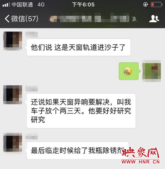 網(wǎng)友的交流內(nèi)容顯示,他們曾先后到各地的4s店進(jìn)行過維修,除了少部分4s店表示,需要把車子留在店里檢查三四天時間,其他大部分4s店對于此類問題的解釋均為天窗出現(xiàn)異物所致,而解決辦法也大致相同——對天窗軌道進(jìn)行清理和潤滑。