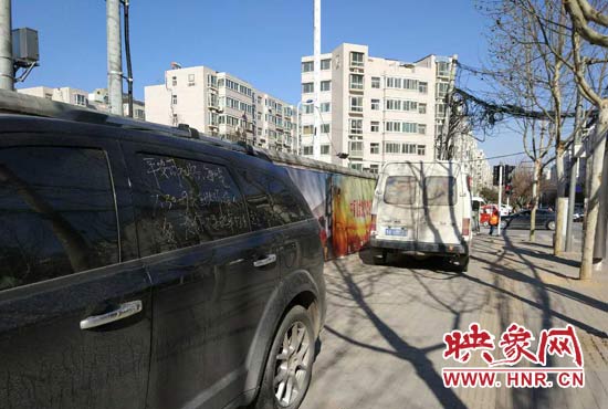 3月26日下午15時30分左右,在汝河路昆侖路交叉口西北角人行道上,一輛黑色越野頭東尾西的停在汝河路北邊的人行道上,右邊車窗上有人用黃色粉筆寫了兩行大字提醒車主把車挪走。
