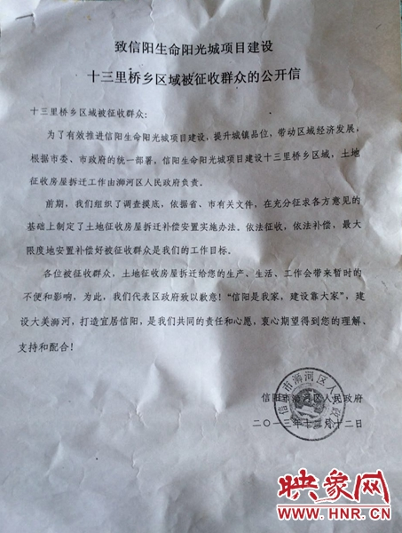 浉河區(qū)政府下達(dá)的征收公開(kāi)信 吳彥飛 攝
