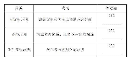 請你根據(jù)生活常識,將以下垃圾填入上表對應(yīng)的“回收箱”類別中。①廢燈管 ②瓷磚瓦片 ③香蕉皮 ④剩菜剩飯 ⑤喝過的茶葉 ⑥過期藥品 ⑦廢塑料袋 ⑧廢玻璃