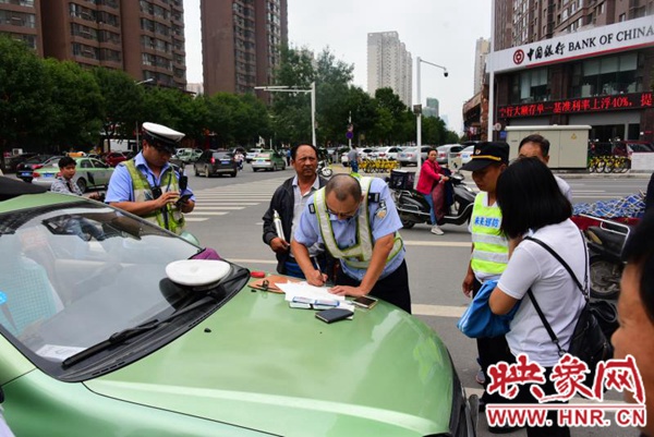 在路口的西南角,停著一輛出租車。鄭州市交警四大隊(duì)兩名民警正向雙方當(dāng)事人詢問(wèn)情況。
