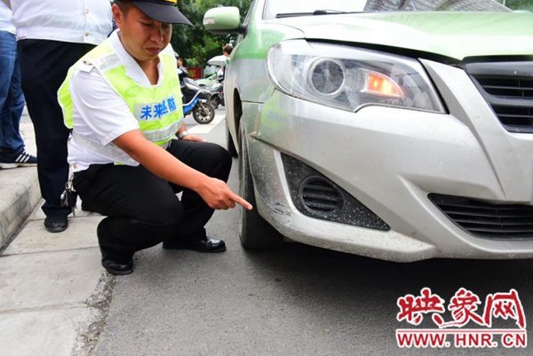 檢查發(fā)現(xiàn),出租車右前車輪前的保險(xiǎn)桿上有幾道清晰的刮蹭痕跡,但出租車司機(jī)否認(rèn)是今天留下的。