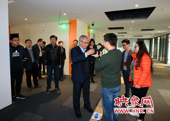 在映象網(wǎng)VR體驗區(qū),易滌非一行還饒有興致的戴上VR眼鏡,親身體驗了由映象網(wǎng)和河南城市VRAR研究院合作開發(fā)的HVR互動體驗系統(tǒng),并對映象網(wǎng)的這一場景式互動創(chuàng)新體驗給予肯定。