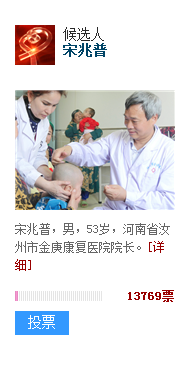 映象網(wǎng)汝州訊(記者 楊增強(qiáng))河南仁醫(yī),感動(dòng)中國(guó)!映象網(wǎng)記者12月26日獲悉,“感動(dòng)中國(guó)”2017年度候選人物已經(jīng)投票已經(jīng)開(kāi)始,由河南省委宣傳部選報(bào)的我省候選人汝州市金庚康復(fù)醫(yī)院院長(zhǎng)宋兆普入圍,網(wǎng)友可關(guān)注央視網(wǎng)投票頁(yè)面(點(diǎn)擊下圖)為這位河南仁醫(yī)進(jìn)行投票。