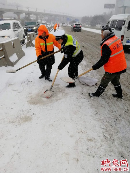 從1月3日早上7點(diǎn)開(kāi)始,鄭州交警就開(kāi)始上路執(zhí)勤,交警三大隊(duì)全體民警提前7:00到崗,準(zhǔn)備融雪劑拋灑車(chē)5臺(tái),準(zhǔn)備融雪劑100噸,鏟車(chē)3臺(tái),不間斷作業(yè)清除轄區(qū)道路的積雪。