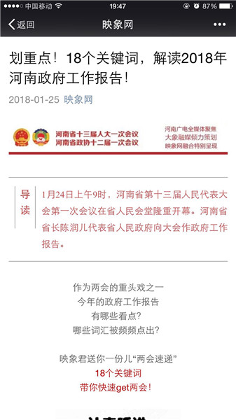 映象網(wǎng)官方微信策劃推出原創(chuàng)策劃《河南人,2018給你穩(wěn)穩(wěn)的幸福!》、《你好,我是河南!這是我的五年成績單,請接收!》、《2018年,河南都有哪些“小目標(biāo)”?》、《劃重點!18個關(guān)鍵詞,解讀2018年河南政府工作報告!》。每篇都刷屏朋友圈,網(wǎng)友積極轉(zhuǎn)發(fā)點贊,稱“看完真的覺著穩(wěn)穩(wěn)的幸?!薄?/p>