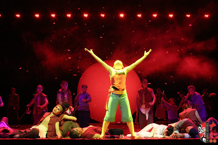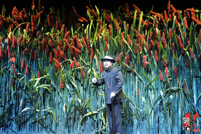 本劇以蓬蓬勃勃、充滿(mǎn)野性、有著旺盛生命力的紅高粱為意像,以九兒和十八刀的愛(ài)恨情仇為主線,描繪了上個(gè)世紀(jì)三、四十年代,先民們敢愛(ài)、敢恨、敢生、敢死的自由精神與生命氣度以及他們對(duì)入侵者不惜用鮮血和生命抗?fàn)?、可歌可泣而又悲壯慘烈的過(guò)程。最后九兒用高粱酒做炸藥,引爆了日本人的軍火車(chē),軍火車(chē)的爆炸又扎爆了熟透了的高粱米,滿(mǎn)天都飄灑著絢麗的高粱花——這是他們的鮮血之花、靈魂之葩,更是他們精神的升華。