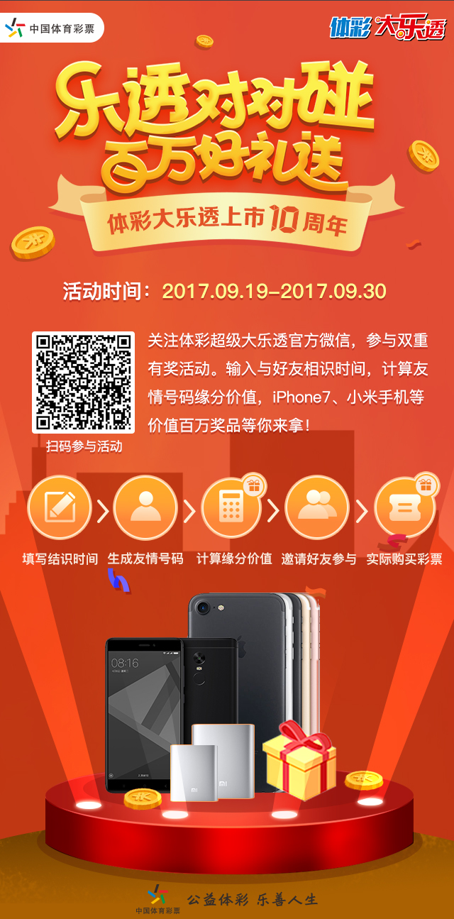 本次活動(dòng)于2017年9月19日至30日在體彩超級(jí)大樂透官方微信進(jìn)行?;顒?dòng)以體彩大樂透10周年為背景,以“友誼”為主題,采用線上、線下相結(jié)合的活動(dòng)方式,為彩友們提供了雙重好禮?;顒?dòng)期間,彩友們只要關(guān)注體彩超級(jí)大樂透官方微信,點(diǎn)擊底部“樂透有禮”菜單即可進(jìn)入活動(dòng)頁(yè)面,或掃描活動(dòng)二維碼直接進(jìn)入頁(yè)面參與。在活動(dòng)首頁(yè)點(diǎn)擊“碰碰運(yùn)氣”,輸入與好友的相識(shí)時(shí)間,根據(jù)相關(guān)信息生成一注緣分號(hào)碼?;顒?dòng)根據(jù)緣分號(hào)碼10年來(lái)歷史累計(jì)中獎(jiǎng)獎(jiǎng)金進(jìn)行排行,每日根據(jù)排行榜派發(fā)相應(yīng)獎(jiǎng)品。同時(shí),彩友們還可在每周一、三、六體彩大樂透開獎(jiǎng)當(dāng)期,到線下體彩投注站購(gòu)買自己相應(yīng)的緣分號(hào)碼,并通過活動(dòng)平臺(tái)上傳該注號(hào)碼的彩票序列號(hào)贏取更多獎(jiǎng)品。
