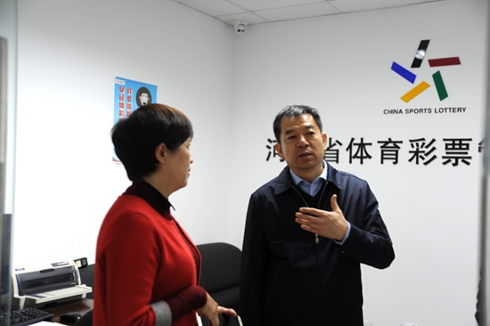 河南省體育局巡視員、黨組成員吳治國(guó)(左)和省體彩中心書(shū)記王海新(右)在分中心調(diào)研