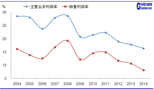 圖2 2004-2014年鐵礦采選業(yè)主營業(yè)務(wù)利潤率和銷售利潤率變化走勢 數(shù)據(jù)來源:中國統(tǒng)計(jì)局