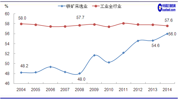 圖4 2004-2014年鐵礦采選業(yè)及工業(yè)全行業(yè)資產(chǎn)負(fù)債率變化走勢 數(shù)據(jù)來源:中國統(tǒng)計(jì)局