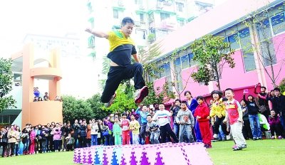 幼兒園男老師縱身一跳,跳過12個(gè)障礙墊,令在場(chǎng)的孩子們興奮地尖叫。