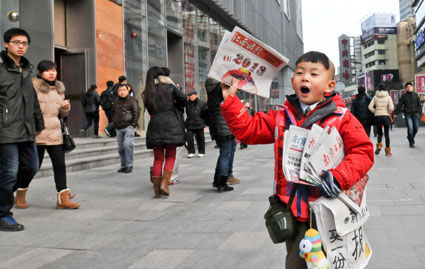 元旦小長假第二天,寒風(fēng)凜冽,氣溫降到-5℃。南京新街口地鐵口川流不息的人流中,一個身穿紅色外套,背著青奧吉祥物“砳砳”的小男孩格外引人注目。他背著一只碩大口袋,報袋上印有“賣一份報紙捐一毛錢”字樣,一邊走一邊叫,“賣報,賣報——”他就是去年大年夜一祼成名的裸跑弟多多,這是他的鷹爸在對他進行財商訓(xùn)練。據(jù)悉,這是鷹式教育“十商并舉”中的重要一環(huán)。