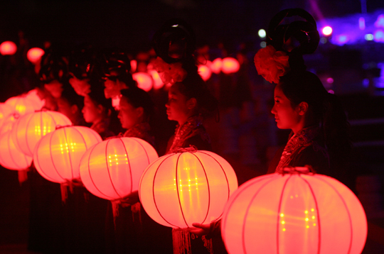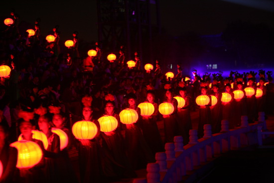 尾聲時(shí),伴隨著一曲《水調(diào)歌頭》,寄托大家心中的美好,這時(shí),無數(shù)盞紅色燈籠由少女們舉過頭頂,緩緩步入舞臺(tái)中央,形成一個(gè)巨大的月亮造型,柔和、寧靜,與遠(yuǎn)處的廊橋樓閣共同組成一幅壯觀的景象,令人回味悠長。